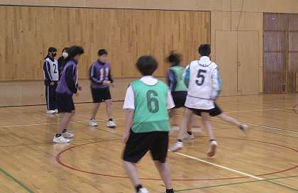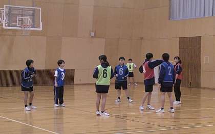 1−Cの体育の授業風景です。バスケットボールをしています。審判も試合の運営も、生徒が主体的に行っています。体育が好きな生徒も苦手な生徒も、全員が笑顔で大活躍の授業、ステキです!