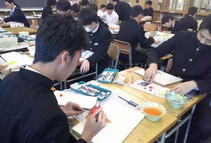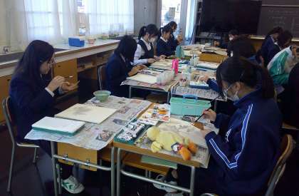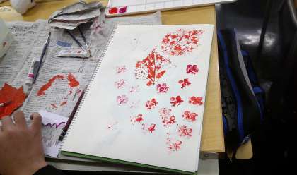 モダンテクニックを学ぶ 2−B美術 公開日 2024/12/10 更新日 2024/12/10 芝園の一日 12月10日(火) 2限 2−Bの美術の授業風景です。モダンテクニックの学習をしています。今日はスタンピングをしています。落ち葉や梱包材などに絵の具を付けて、型押し。面白い模様ができています。