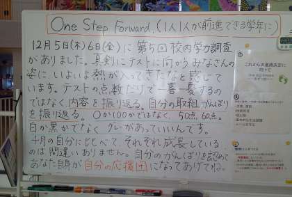 3学年のフロアには、学年主任からのメッセージが描かれています。これから本格的に進路決定となる時期を迎えます。不安になることもあるかも知れません。そんな時は、頑張っている自分を認めて、一歩ずつ前進してほしいと思います。