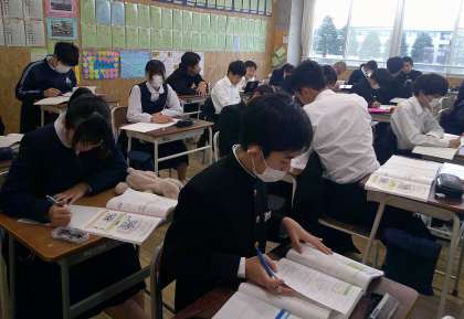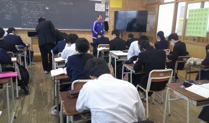 2−Aの数学の授業風景です。三角形に関する学習をしています。分からないところに立ち戻って復習したり、問題をどんどん進めたりなど、自分の学習状況に合わせて、自分で学習内容を決めて学習しています。