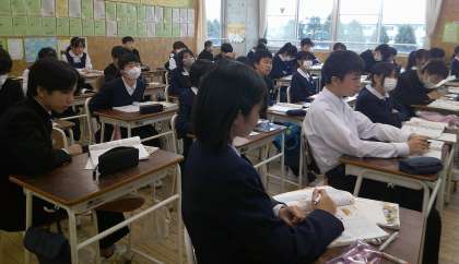 1−Bの家庭科の授業風景です。地域の食文化について学習をしています。お正月にたべるお雑煮。ご当地によって違いがあり、生徒はびっくりしています!
