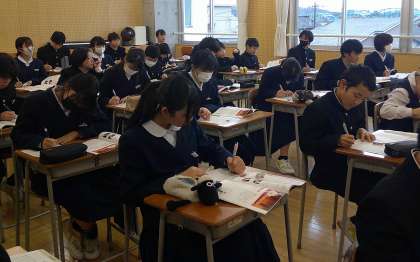 1−Cの音楽の授業風景です。筝曲「六段の調」について学習をしています。箏とはなにか、箏曲の特徴、箏の部位の名前と演奏方法など、これから深く学びます。