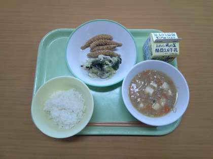 今日の給食 公開日 2024/12/18 更新日 2024/12/18 芝園の一日 12月18日(水) 今日の給食メニューは、 ・ごはん ・牛乳 ・きびなごのさくさく揚げ ・厚揚げの中華煮込み ・海藻サラダ です。 きびなごは、本当にサクサク揚がっていてとても美味しかったです。