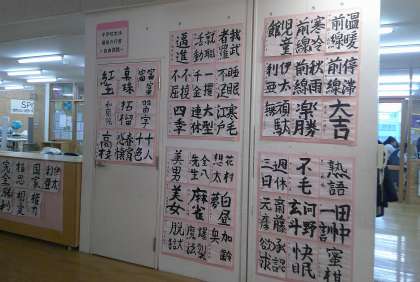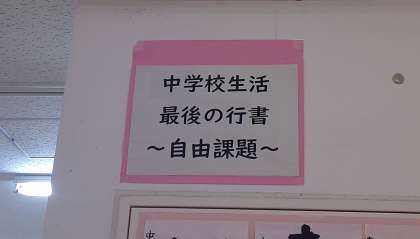 大階段上のフロアには、3年生の書道作品が展示してあります。中学校での国語の時間に書く習字の作品は、これが最後です。それぞれが好きな言葉を書いています。ぜひ、ご覧ください。