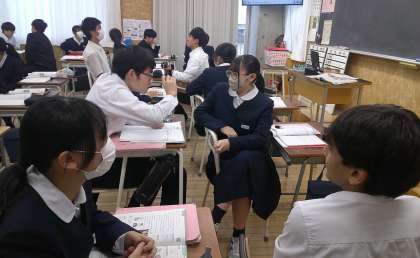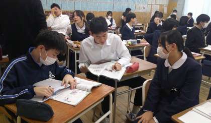 対話をしながら 3−C英語 公開日 2024/12/18 更新日 2024/12/18 芝園の一日 12月18日(水) 2限 3−Cの英語の授業風景です。生徒と先生、生徒同士が対話をしながら、本文を読み進めています。
