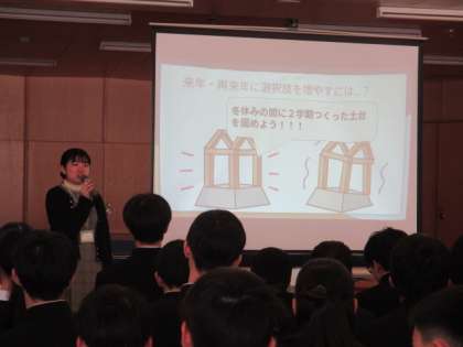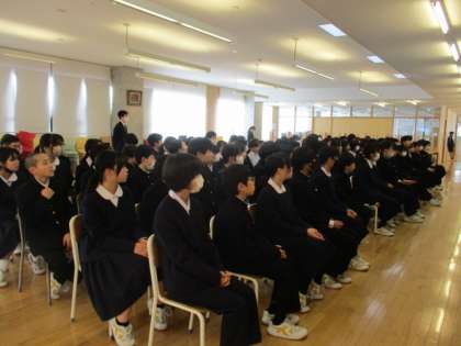 1年生は、2学期を振り返り3学期につなげる学年集会を行いました。