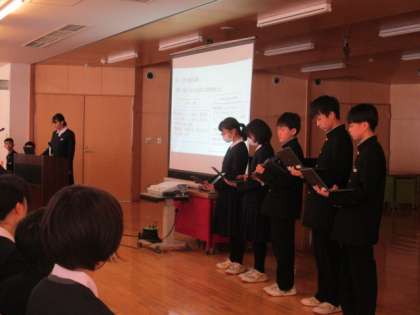学年生徒会や書記会・班長会からの活動報告と3学期の取り組み予定、MVPやSKIPの表彰、先生から生活や学習についての話や学年代表からの話がありました。