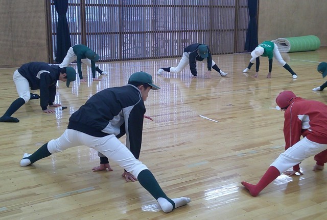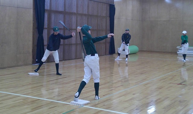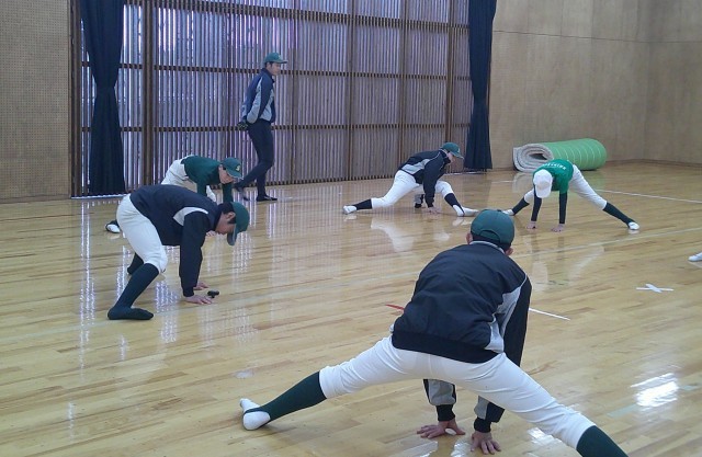 武道館では、野球部が活動しています。地道なトレーニングに励んでいます。冬の頑張りは、必ず春につながります。