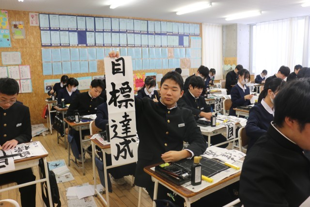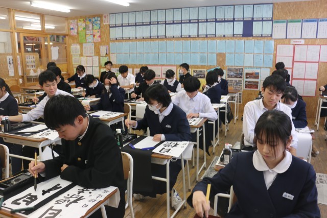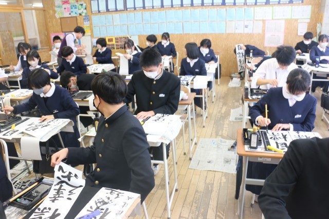 4限に、書き初め大会をしました。中学校生活最後の書き初め。一筆に心を込めていました。