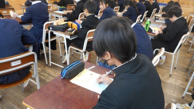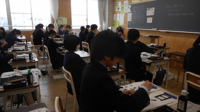 書初大会では、手本を見ながら一画一画丁寧に書く姿は、真剣そのものでした。「家で、50枚練習してきました!」と語る生徒もおり、気合い十分の力作ぞろいです。
