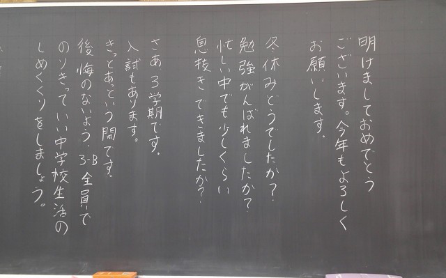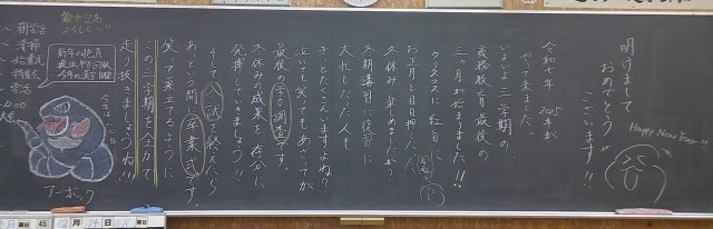 新学期の朝 3学年 その1 公開日 2025/01/08 更新日 2025/01/08 芝園の一日 1月8日(水) 7:50 新学期を迎えて朝校舎内を回ると、どのクラスも生徒への温かいメッセージやイラストが書かれていました。画像は3年生です。