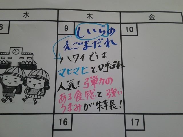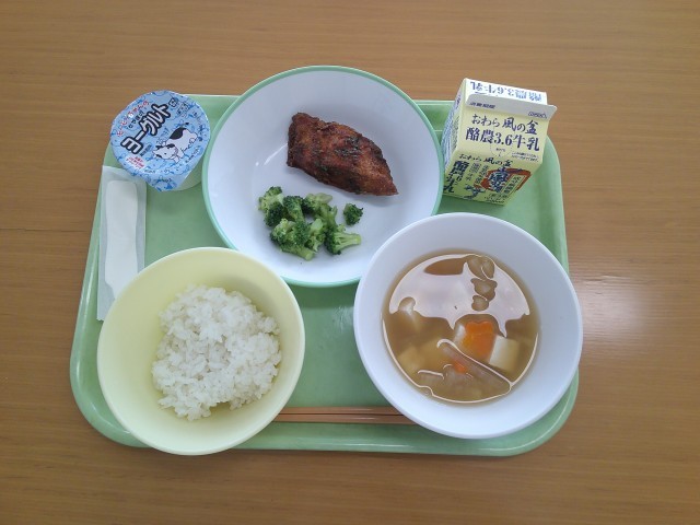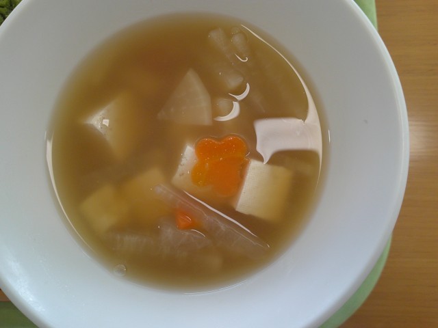 今学期初めての給食です。すいとんの中には、花型のラッキーにんじんを発見!調理員さんの愛を感じました。今学期も、よろしくお願いします。