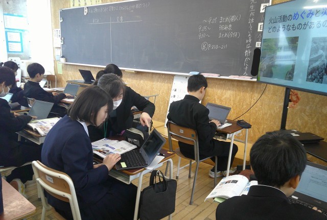 自分でまとめる 1-A理科 公開日 2025/01/10 更新日 2025/01/10 芝園の一日 1月10日(金) 1限 1-Aの理科の授業風景です。火山の活動について、一人一人が教科書、資料集、インターネット等を活用して資料を集めて、分析し考察をしています。端末を活用しながら、自分の言葉で考えをまとめています。ものすごい集中!いいね、1年生!