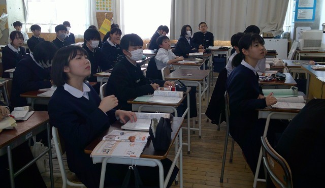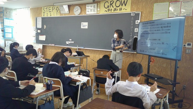 1-Aの家庭科の授業風景です。加工食品のメリット、デメリットについて考えています。実際に食品表示を見て、確認しています。