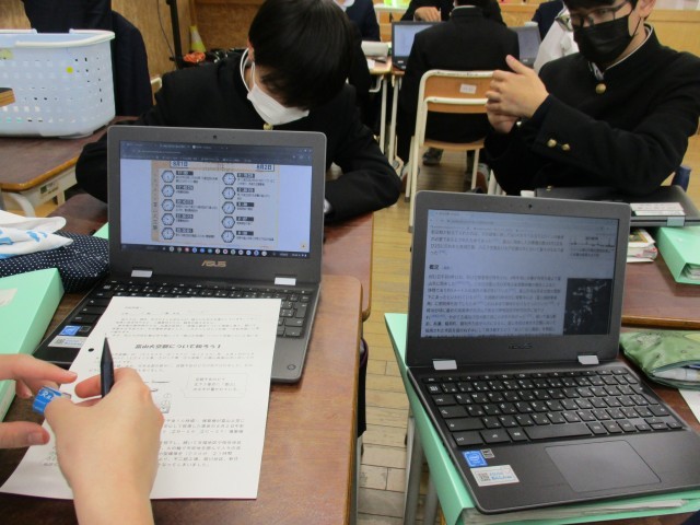 富山大空襲についてのプリントを参考に、クロームブックで当時の様子を真剣な表情で調べていました。