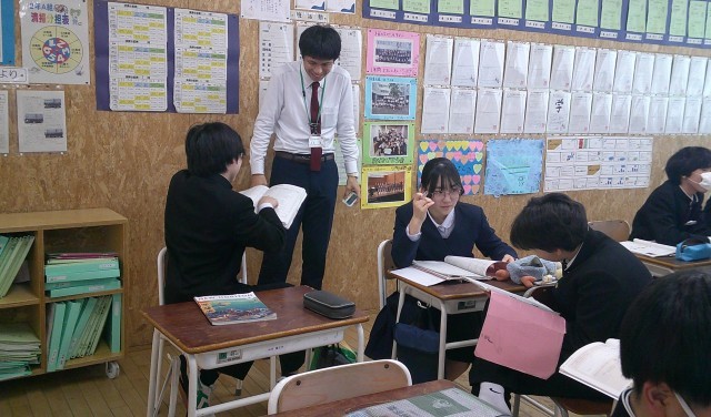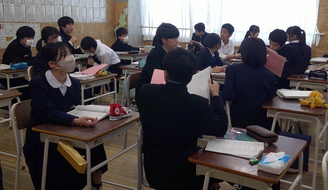 2-Aの英語の授業風景です。ペアで会話の練習をしています。楽しそうですね。