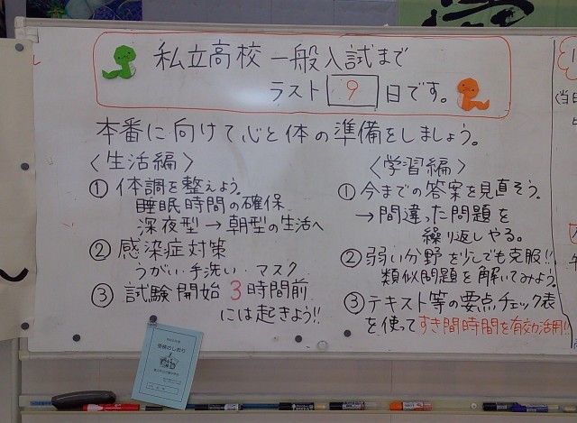 入試に向けて 3学年 公開日 2025/01/28 更新日 2025/01/28 芝園の一日 1月28日(火) 3学年のフロアには、2/6に行われる私立高校一般入試に向けて、学年主任からのメッセージが書かれています。体調を整えて、焦らず、できることを確実にしていきましょう。頑張ろうね、3年生!