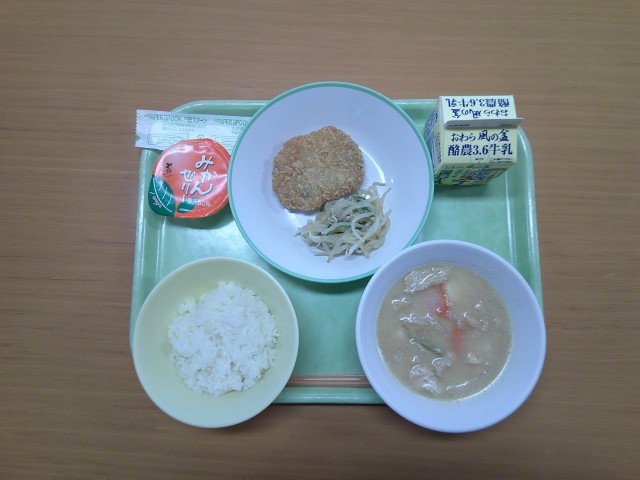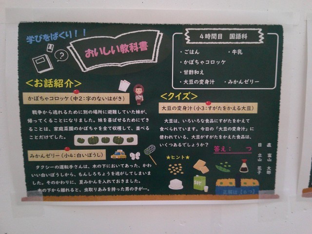学校給食週間特別献立4日目の今日は「国語科」がテーマです。かぼちゃコロッケの「かぼちゃ」は、2年生の国語で学ぶ「字のないはがき」の1シーンをイメージしたものです。甘くて美味しかったです。