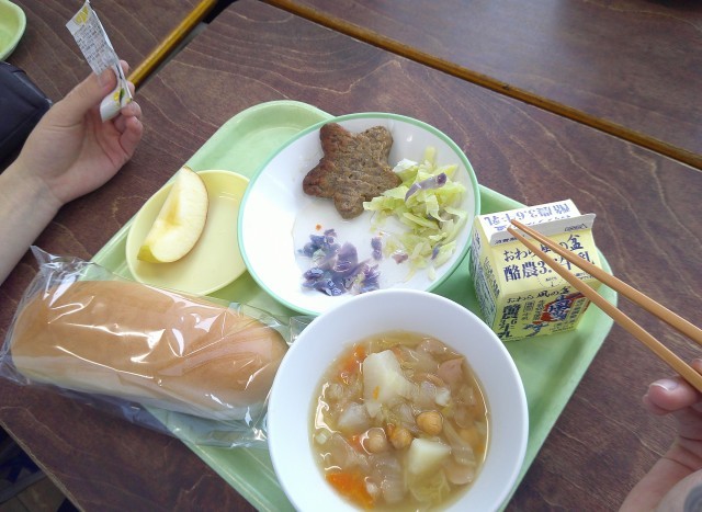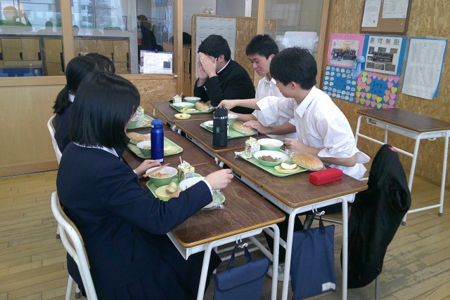 3-Cの給食風景です。和やかなムードいっぱいです。今日の給食のテーマが「理科」。レモン味のドレッシングで、紫キャベツの色が変わるか楽しみながら食事をしています。
