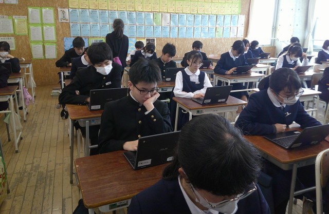 1-Bの理科の授業風景です。端末を使って、単元の確認をしています。