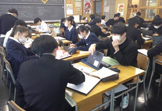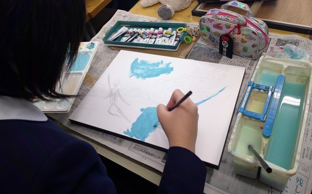 2-Cの美術の授業風景です。空想画のアイディアを、いよいよパネルに下書きしています。中には、彩色している生徒も・・・。完成が楽しみですね。