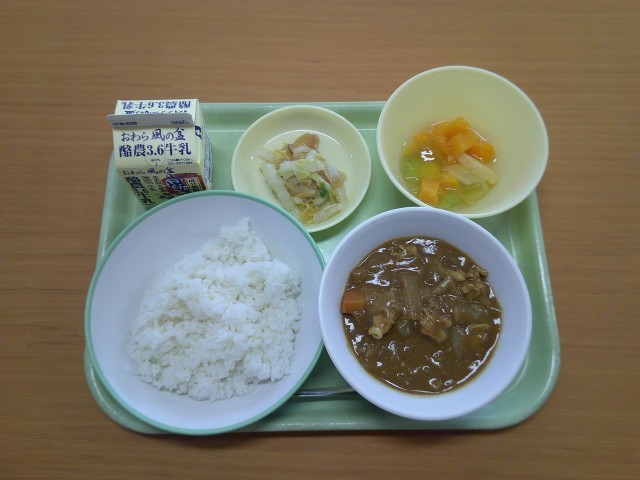 みんな大好きカレーライス。朝、3年生が「今日はカレーライスだ~!」と、友達と嬉しそうに会話をしながら登校していました。給食のカレーライスは、特別に美味しいです!