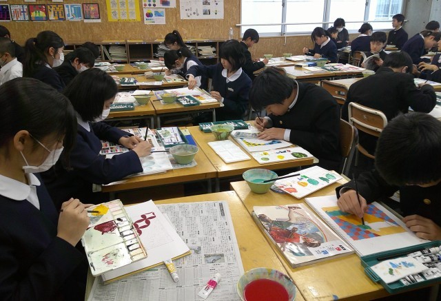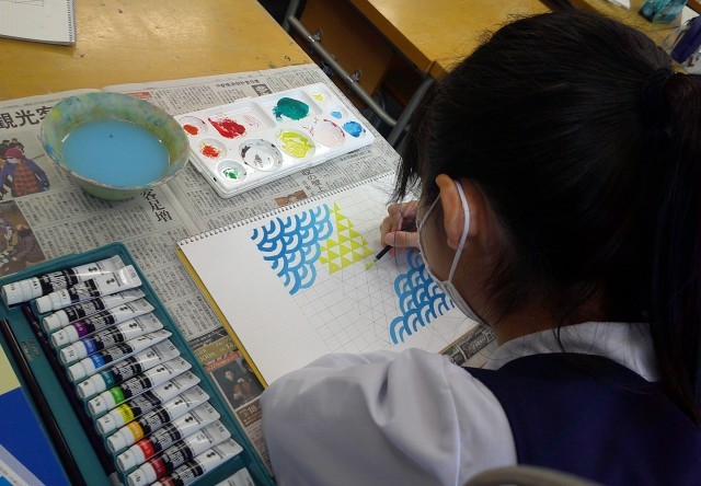 1-Bの美術の授業風景です。和の文様をデザインしています。