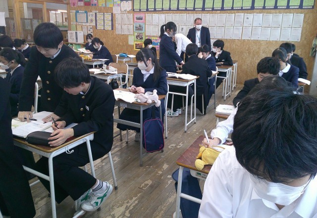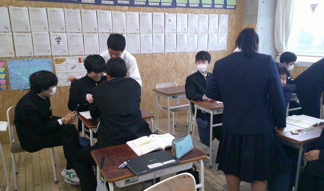 2-Aの数学の授業風景です。分からないところは仲間と相談。理解を深めています。