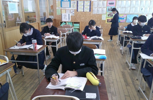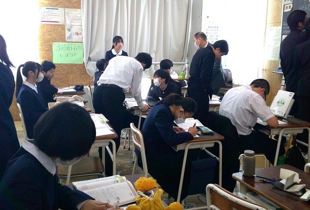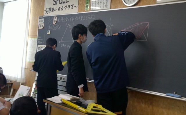 2-Aの数学の授業風景です。平行四辺形の証明問題に取り組んでいます。主体的に学ぶ姿勢、ステキです