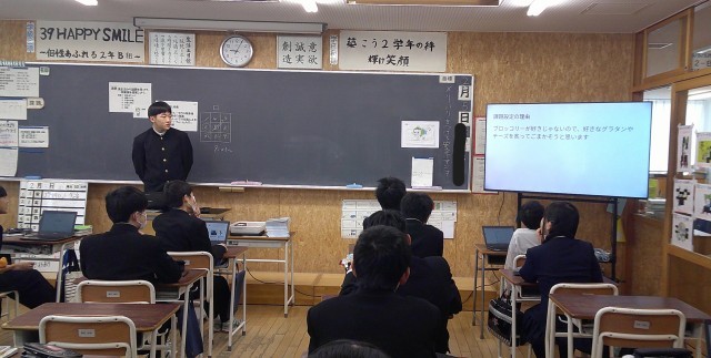 課題追究学習 発表会 2-B家庭科 公開日 2025/02/05 更新日 2025/02/05 芝園の一日 2月5日(水) 1限 2-Bの家庭科の授業風景です。自分の食生活を振り返り、見つけた課題の追究学習の発表会です。苦手なブロッコリー克服のために、グラタンを作って課題解決を図った生徒の発表です。グラタン、とっても美味しそうですね。