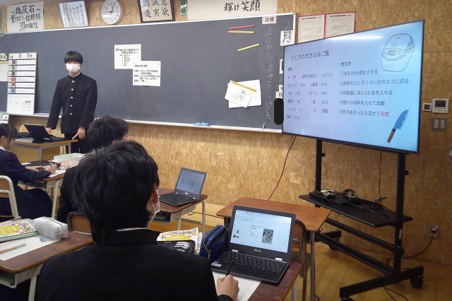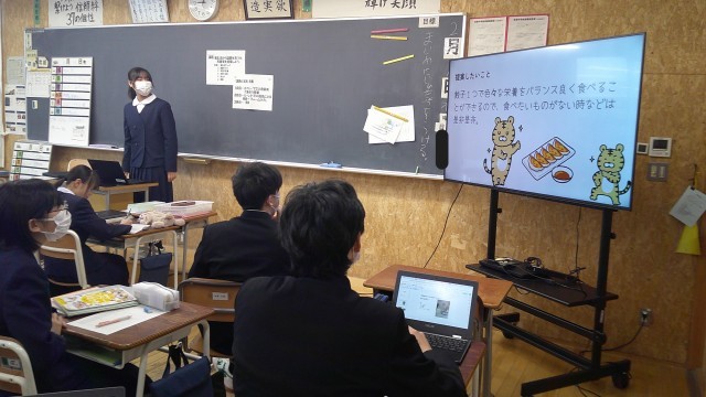 2-Cの家庭科の授業風景です。課題の追究学習の発表会です。野菜嫌い克服のための、ギョウザやひじきごはん、カレーなどの調理実践をした報告がありました。