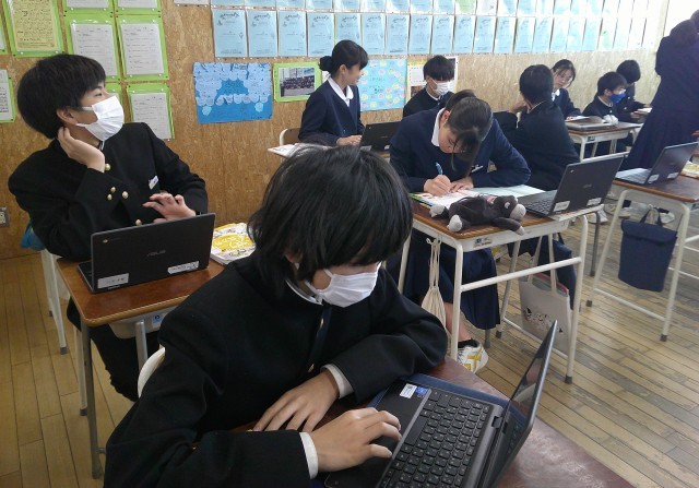 1-Bの家庭科の授業風景です。調理実習のスライド作りをしている生徒、学年末考査に向けて学習している生徒など、それぞれが自分の課題に取り組んでいます。