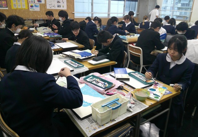 2-Cの美術の授業風景です。「空想の世界」のデザイン制作です。
