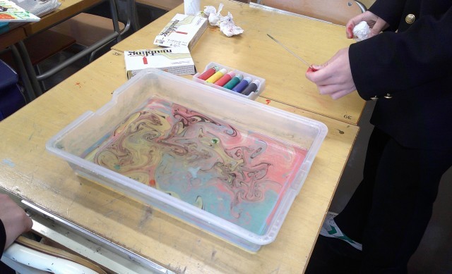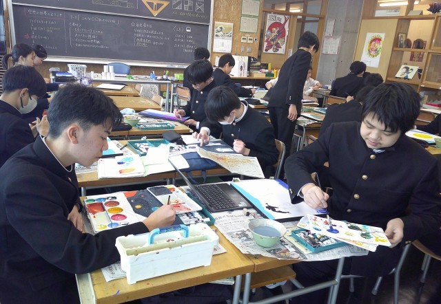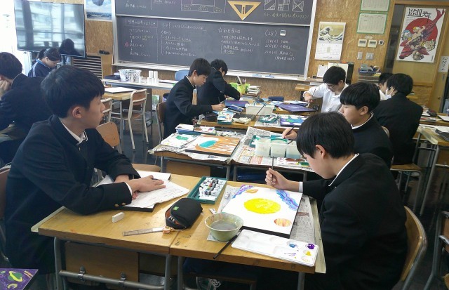 空想の世界 2-B美術 公開日 2025/02/18 更新日 2025/02/18 芝園の一日 2月18日(火) 2限 2-Bの美術の授業風景です。マーブリングを用いてデザインするなど、個性的な作品が多く見られます。