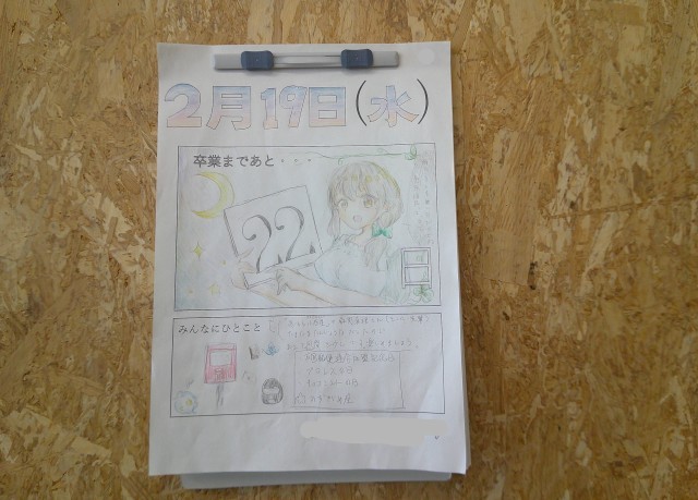 カウントダウンカレンダー 3年 公開日 2025/02/19 更新日 2025/02/19 芝園の一日 2月19日(水) 3年生の教室には卒業までの「カウントダウンカレンダー」が掲示してあります。中学校で過ごす1日1日を大切にしてほしいと思います。