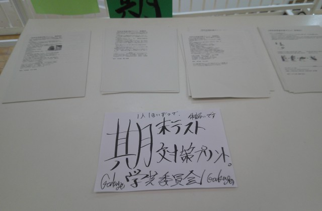 2学年のフロアには、学芸委員会で作成した「学期末考査対策プリント」が置いてあります。テストに向けて、みんなで頑張る雰囲気、ステキですね。