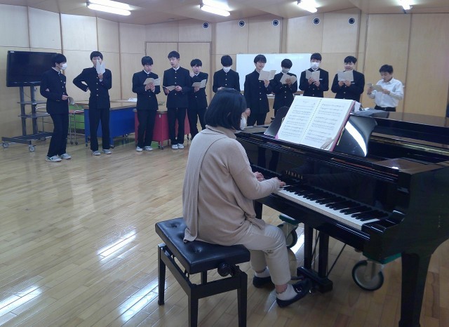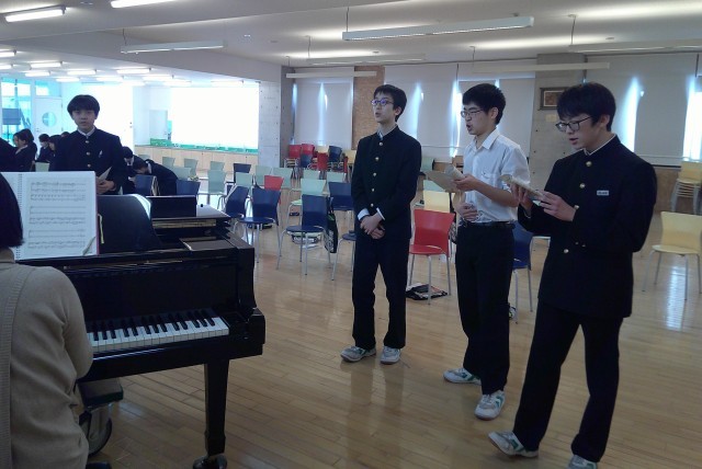 2-Bの音楽の授業風景です。卒業生へ贈る歌の練習をしています。まずは、男子のパート練習。美しく、重厚な歌声がランチルームに響いています。ステキです、2年生!