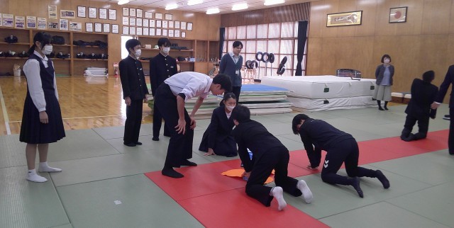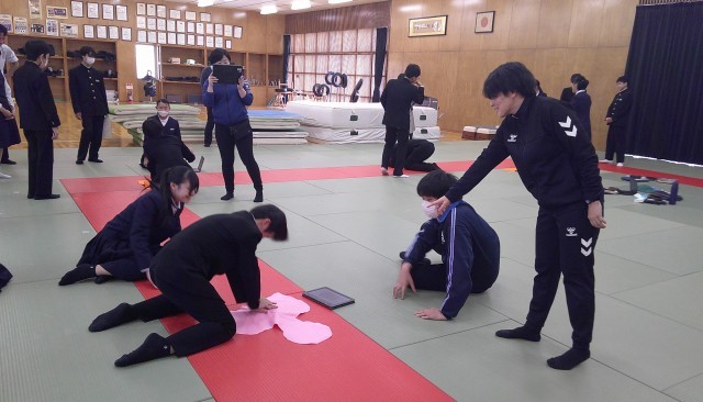 動画等で心肺蘇生法を学習した後は、実際に練習しました。先生お手製の人形で、胸骨圧迫の練習もしています。なぜ心肺蘇生法を学ばなければならないのか、生徒はその果たす役割を十分理解して、意欲的に実習をしていました。