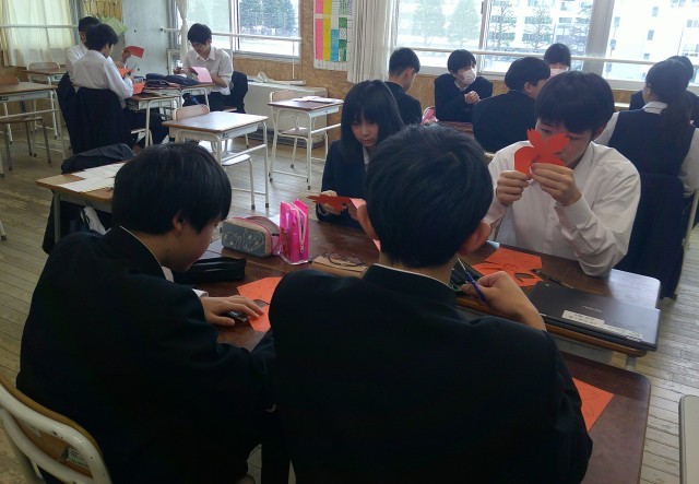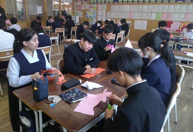 体育大会、合唱コンクール、3年生との思い出を話ながらカードを作っています。