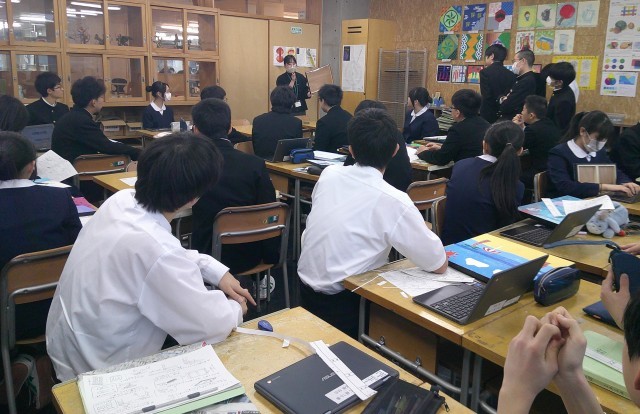 2-Cの美術の授業風景です。空想の世界のデザイン制作も、いよいよ完成間近です。パネルに張るシートの説明を受けています。展示が楽しみですね。