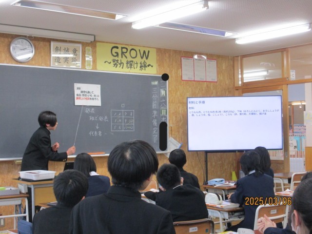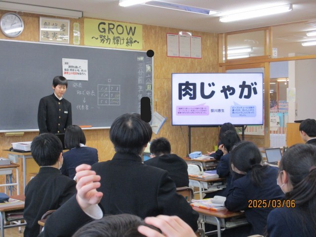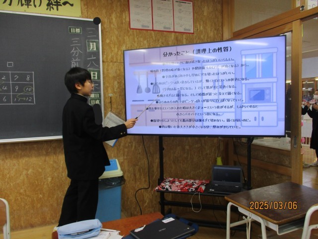 発表「食品の調理上の性質」 1C 家庭科 公開日 2025/03/07 更新日 2025/03/07 芝園の一日 3月6日(木)1年生の家庭科では、「野菜・いも・肉」について学び、家庭での実習を通して学んだ「調理上の性質」をまとめて発表しました。
