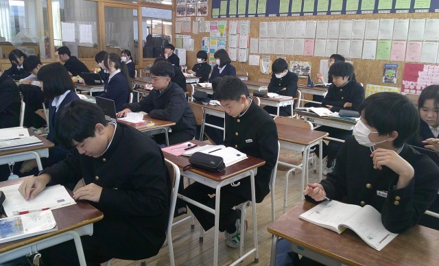 2-Bの国語の授業風景です。田村隆一氏の詩「木」の学習をしています。