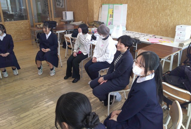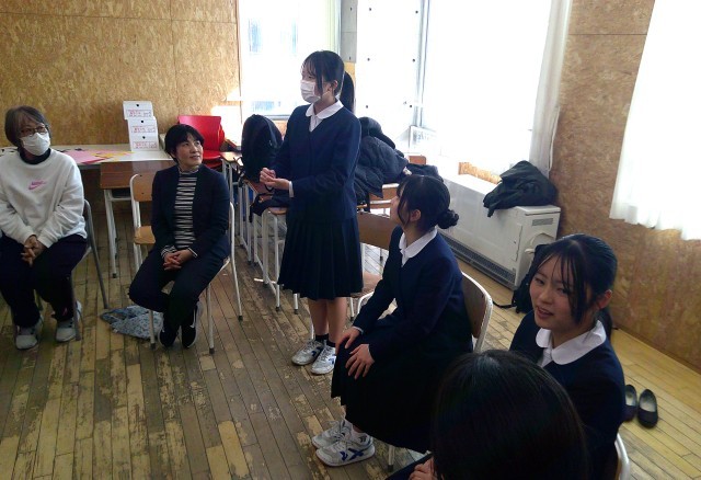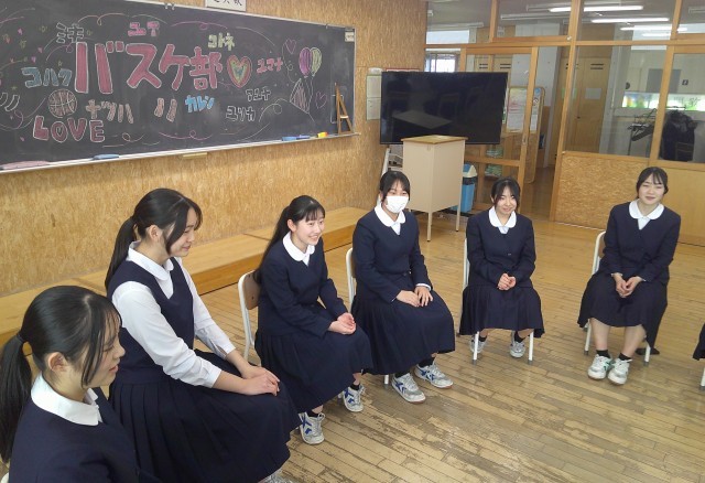 女子バスケットボール部です。恒例の円陣。いつも元気な3年生に後輩も笑顔です。