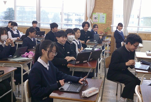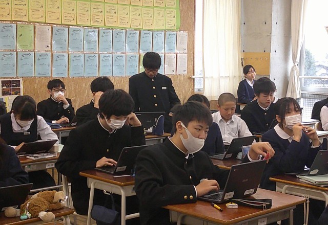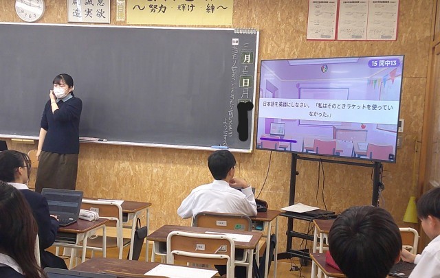1-Bの英語の授業風景です。1年間学習したことを、ゲーム形式で振り返っています。1年間、よく学びました!