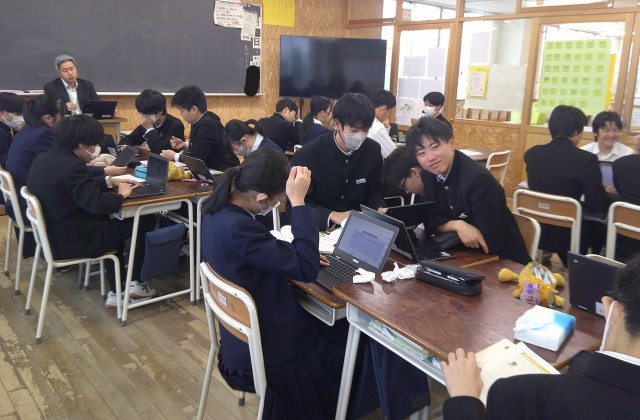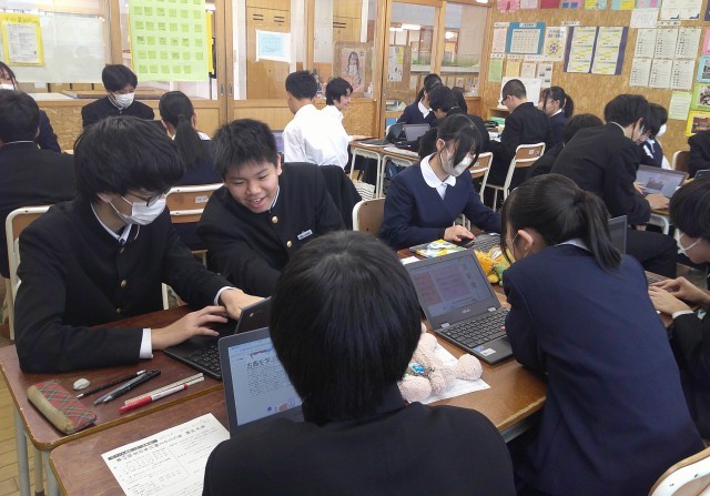 2-Aの国語の授業風景です。1年間の国語の授業で学んだことを、各グループで新聞にまとめています。