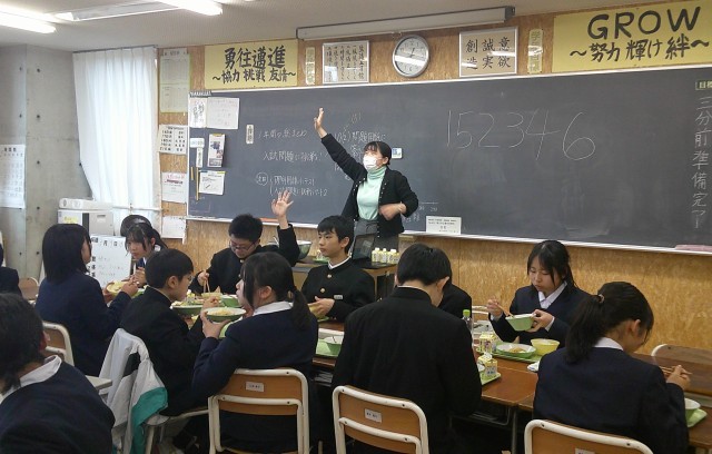 今年度の給食も、今日を含めて2回となりました。画像は、1-Cです。豚キムチのおかわりジャンケン大会。楽しそうですね。
