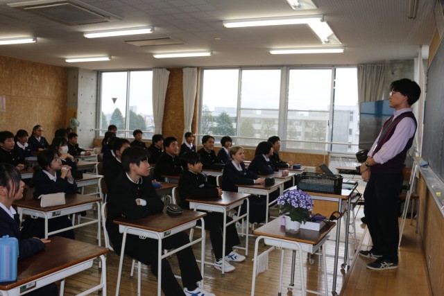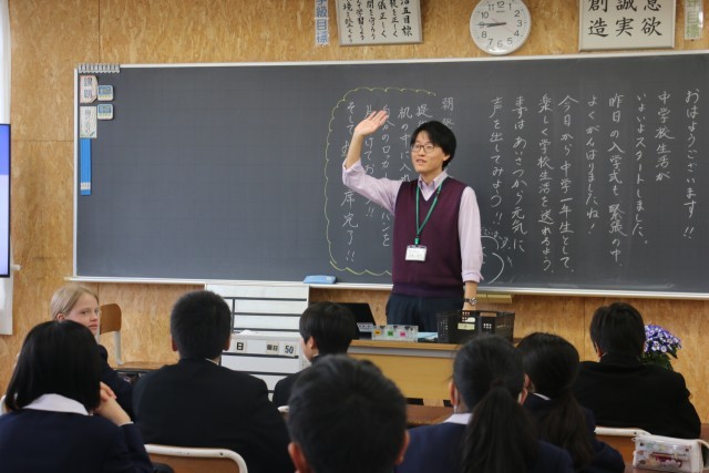 1Aの様子です。担任からの自己紹介、クラスへの思いなどを伝えています。