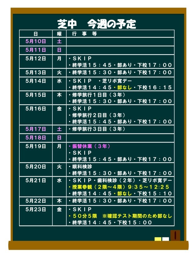 5月10日(土)から5月23日(金)までの予定について