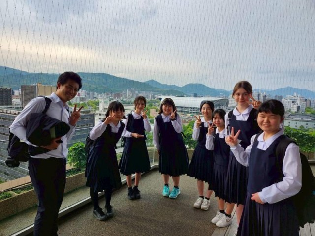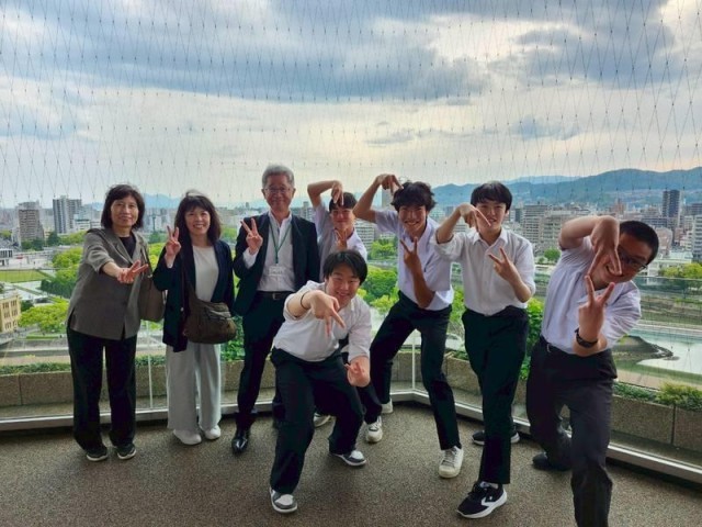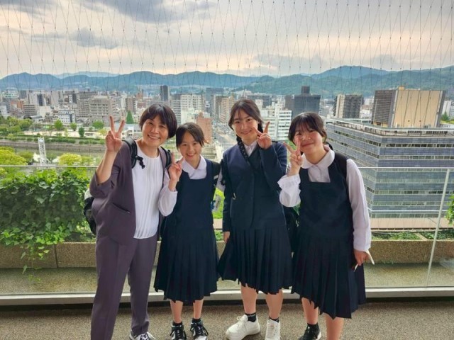 修学旅行1日目 折り鶴タワーで先生方と一枚