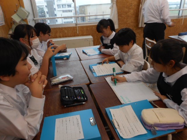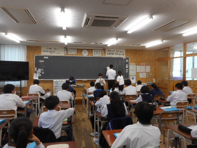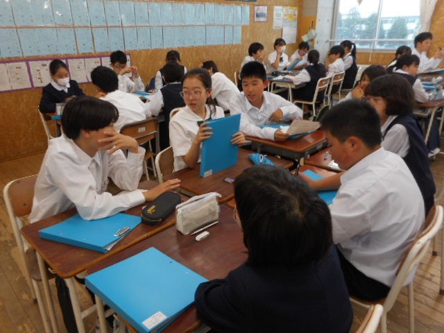 1年A組の生徒が3年生の授業を参観したのち、「自分たちができていること」や「自分たちの課題」についてグループで話し合いました。
